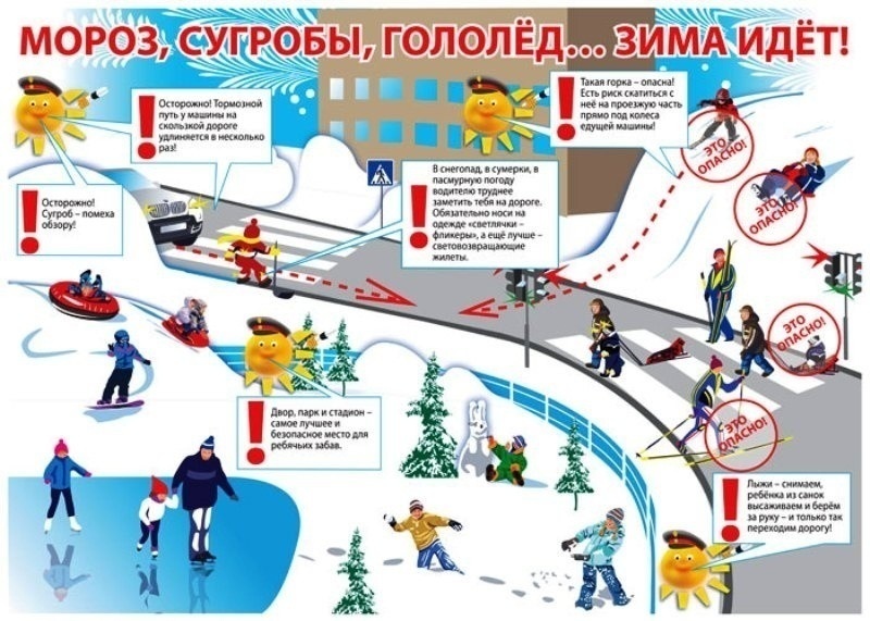 Зимой возрастает число дорожно-транспортных травм. Часто ребенок видит, что машина приближается, надеется проскочить, но на скользкой дороге водитель не успевает затормозить, поскольку увеличивается тормозной путь автомобиля. Пересекать проезжую часть дороги необходимо исключительно по пешеходному переходу ни в коем случае не перебегать, следует быть предельно внимательными. Обязательно соблюдать правила дорожного движения.