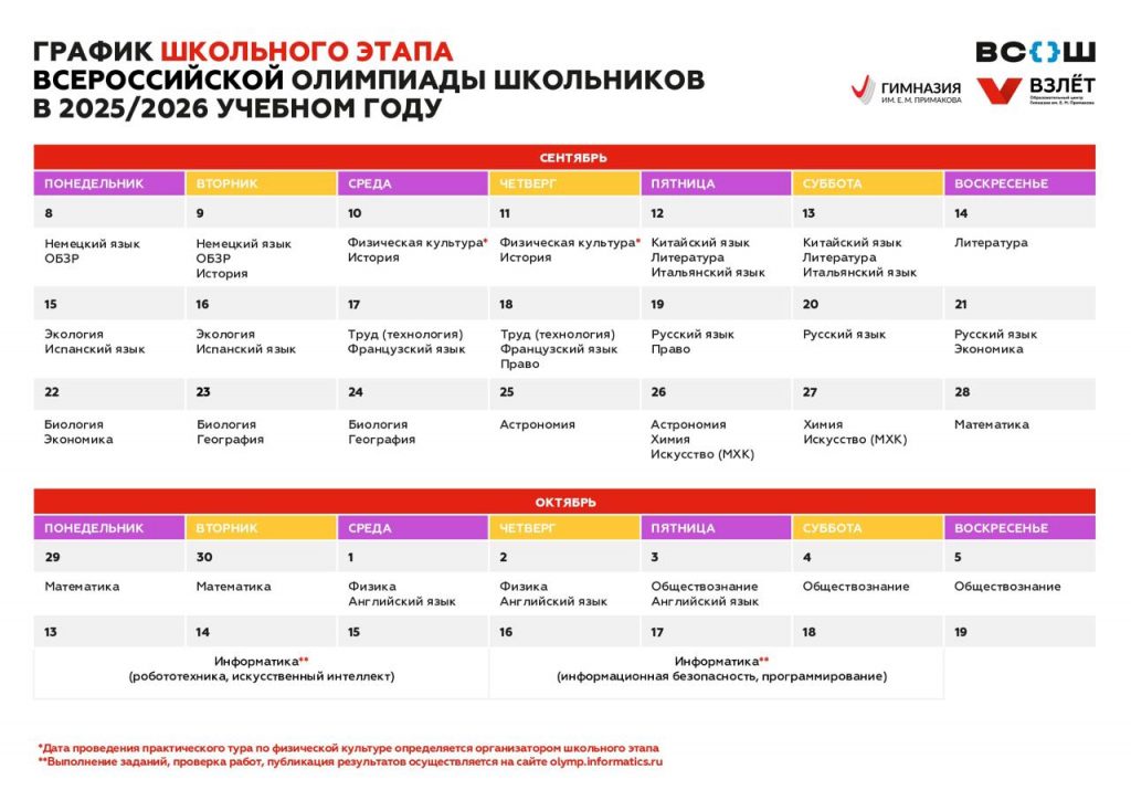ГРАФИК ШКОЛЬНОГО ЭТАПА ВСЕРОССИЙСКОЙ ОЛИМПИАДЫ ШКОЛЬНИКОВ